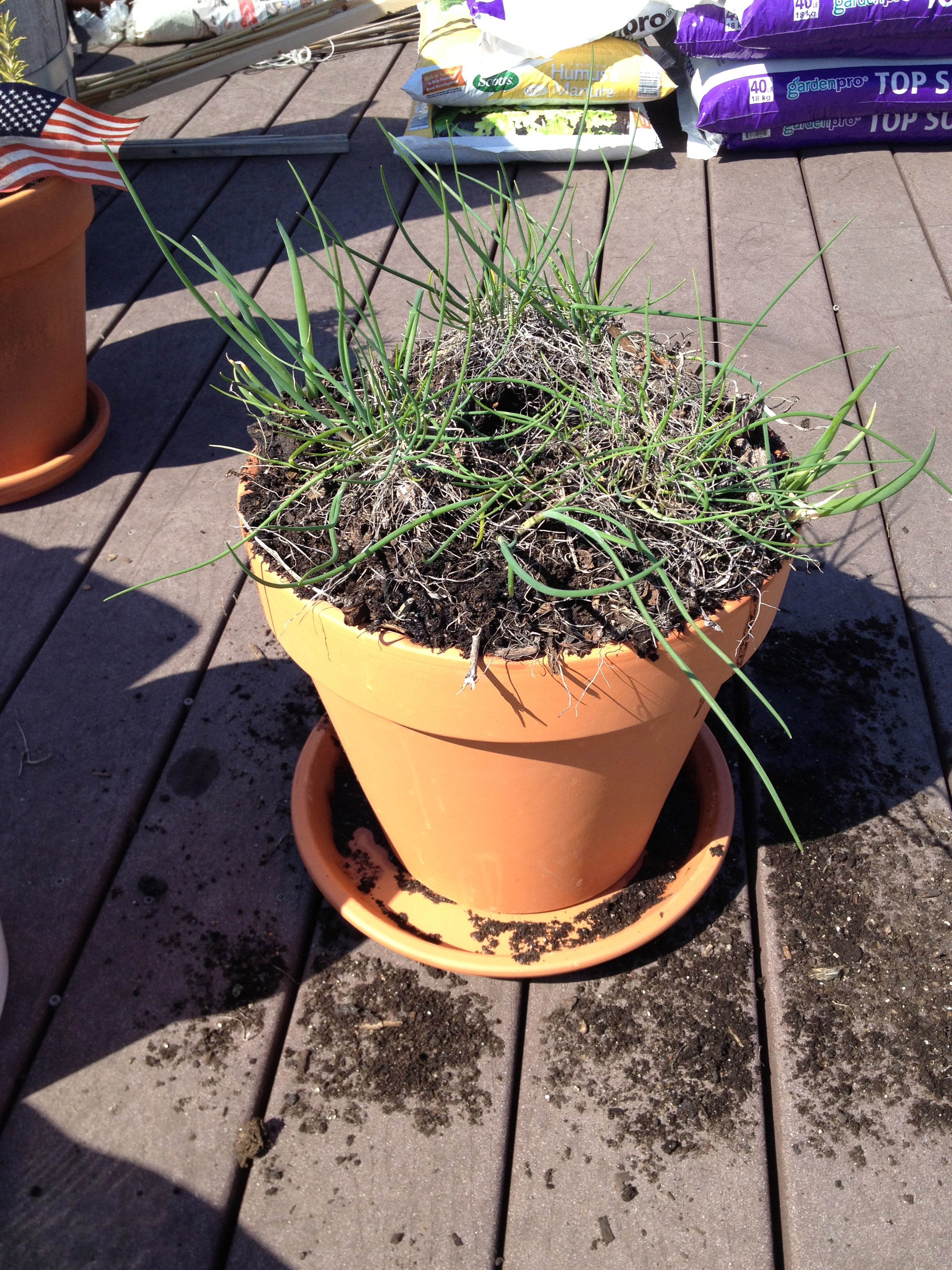 Temporary home for chives and onions that came back this year.