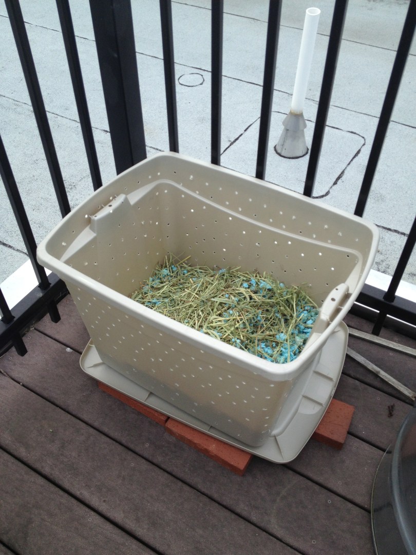 Layer of paper litter and hay as “brown” material to offset the rest of the wet stuff.